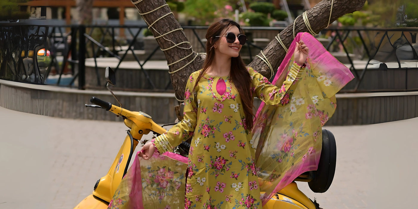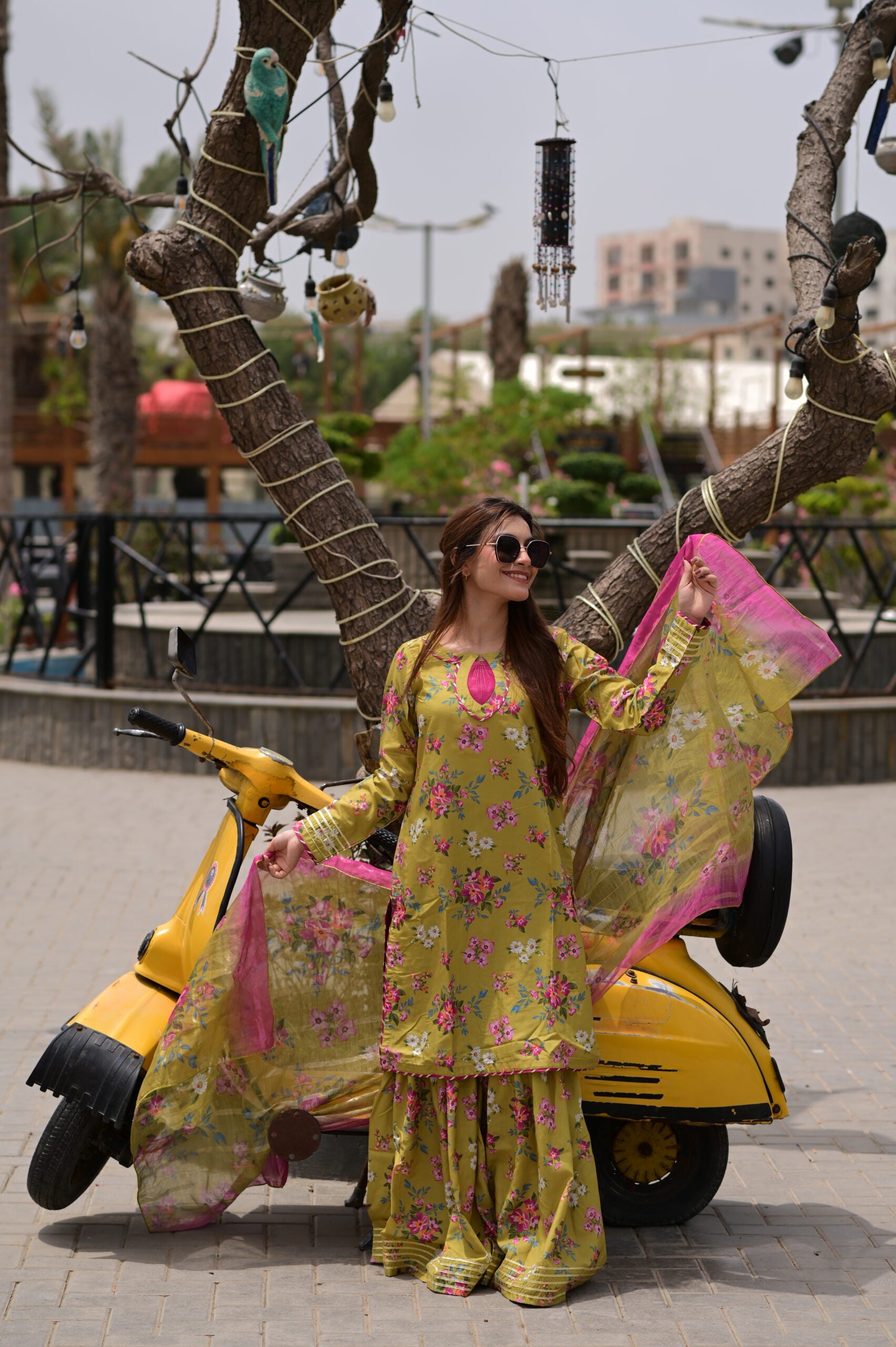 Unveil the charm of blossoming beauty with our MOHAR BAGH 3-piece dress. This floral masterpiece is elegantly designed with pleated organza detailing on the neckline, finished with intricate lacework that adds a touch of timeless elegance. Perfect for those who appreciate the art of dressing beautifully.