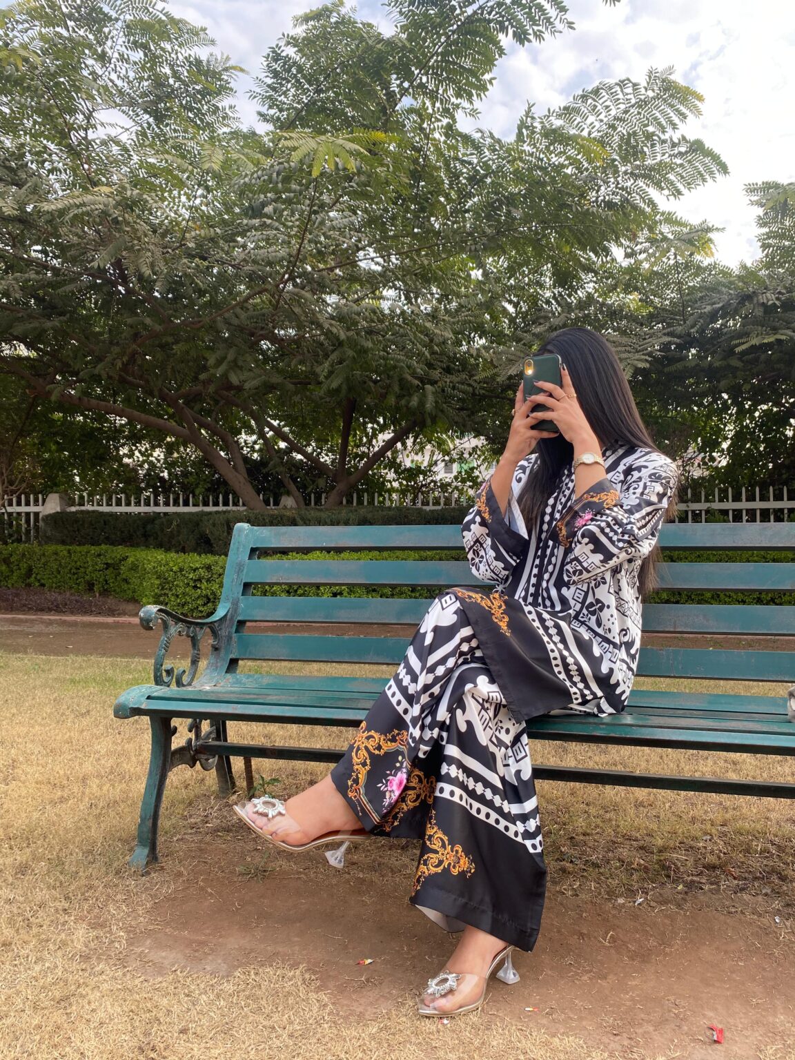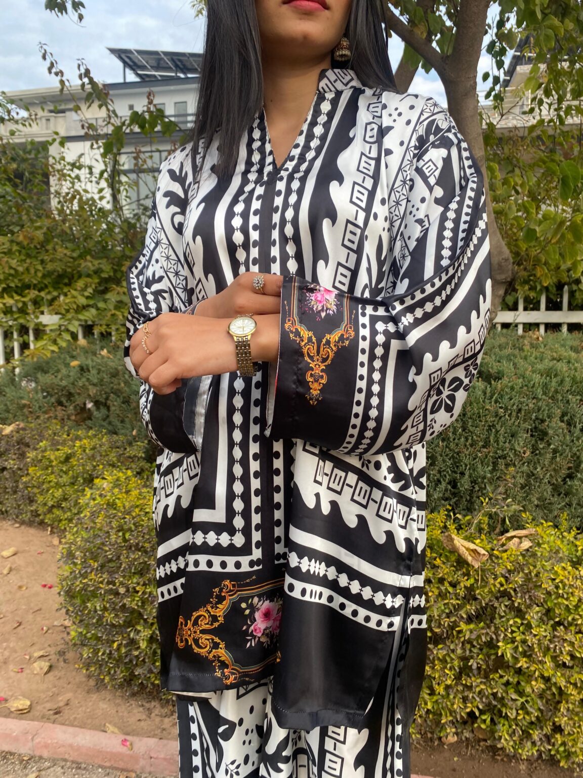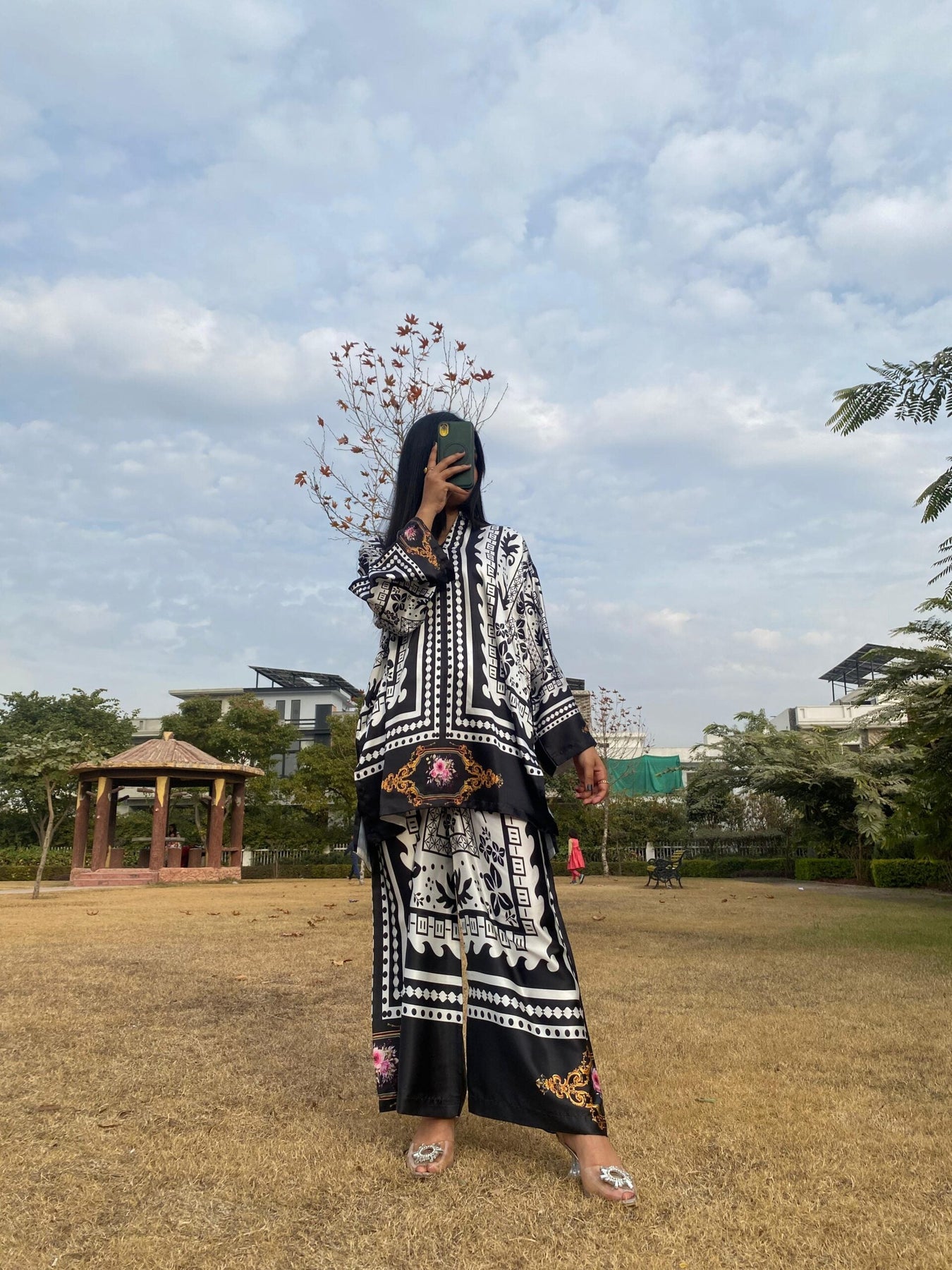Baroque inspired black and white printed 2pc silk co’ord set-